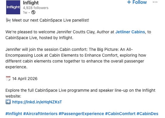 CILTNA member, Jennifer Coutts Clay FCILT and author at Jetliner Cabins, is joining a panel at CabinSpace Live hosted by Inflight on 14 April during the 2026 Aircraft Interiors EXPO in Hamburg.